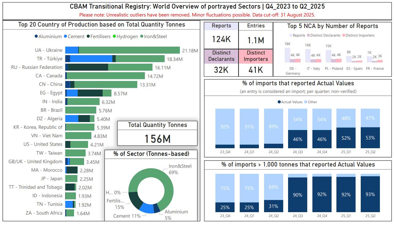 (5)默认值和实际值使用方面,2023年Q4-2024年Q2,约90%的进口使用默认值报告,从2024年Q3开始,使用实际值报告才开始显著增加,但仍有近50%使用默认值报告;值得说明的是,超过1000吨的进口中,在2023年Q4-2024年Q2,使用实际值报告的从25%增加到31%,但2024年Q3开始,这个比例已经增加到超过90%,这也说明,使用的默认值报告的主要是集中在低于1000吨的进口。